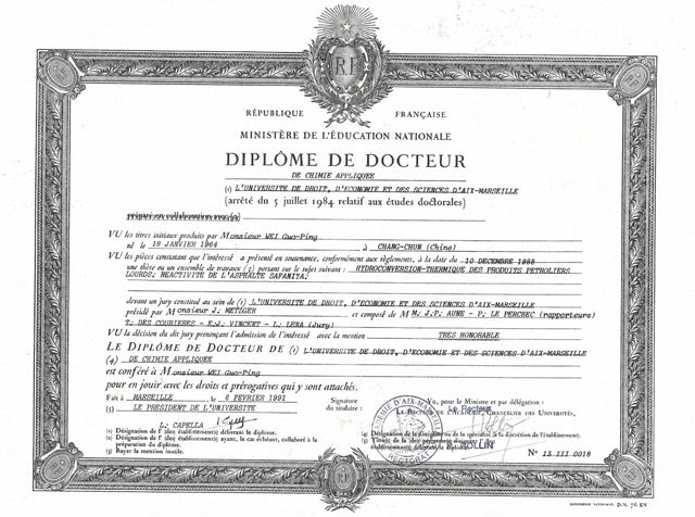 1988年12月10日,奧吉娜集團創始人魏國平博士以“優秀”成績通過了馬賽石油化學及工業有機合成學院EPSOI博士論文答辯,取得博士學位。